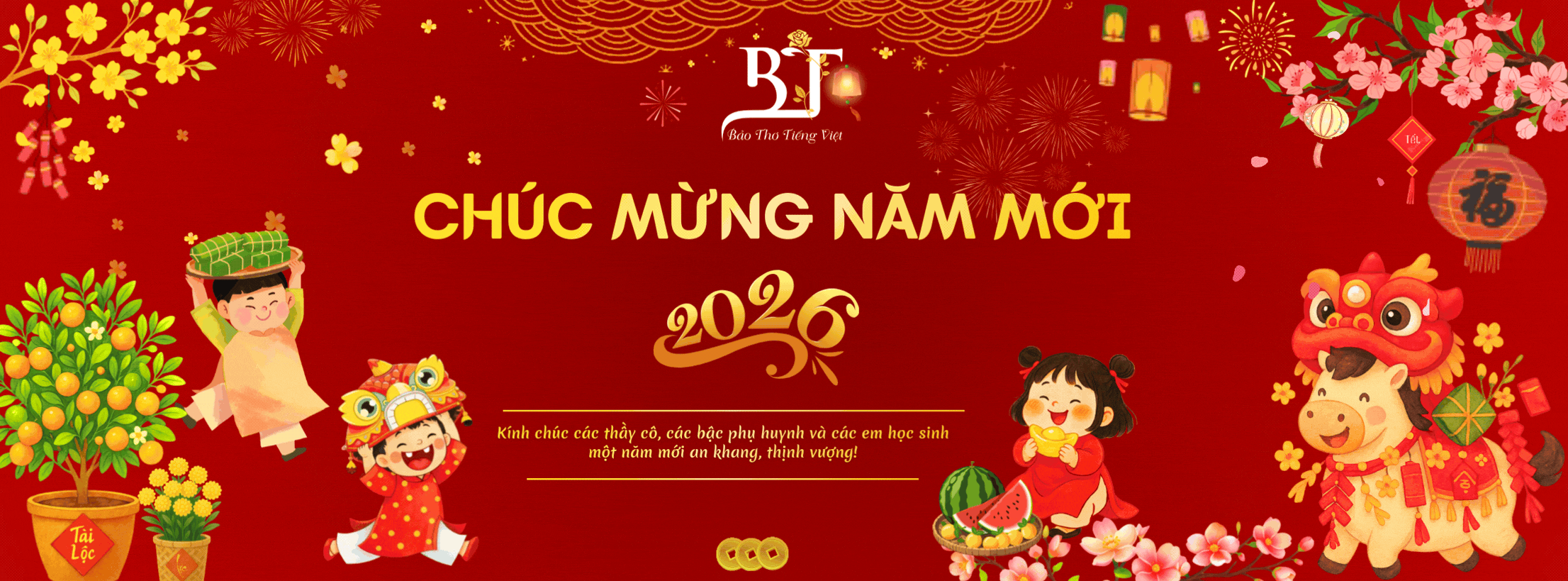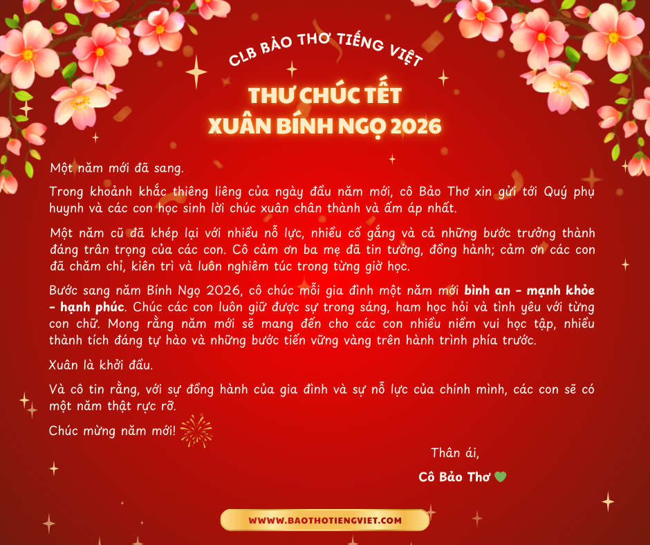 Bước sang năm Bính Ngọ 2026, kính chúc mỗi gia đình một năm mới An khang – Bình an – Hạnh phúc. Chúc các con luôn chăm ngoan, tự tin, học tập tiến bộ và tiếp tục nuôi dưỡng tình yêu với Tiếng Việt – với từng con chữ, từng bài văn, từng trang sách.