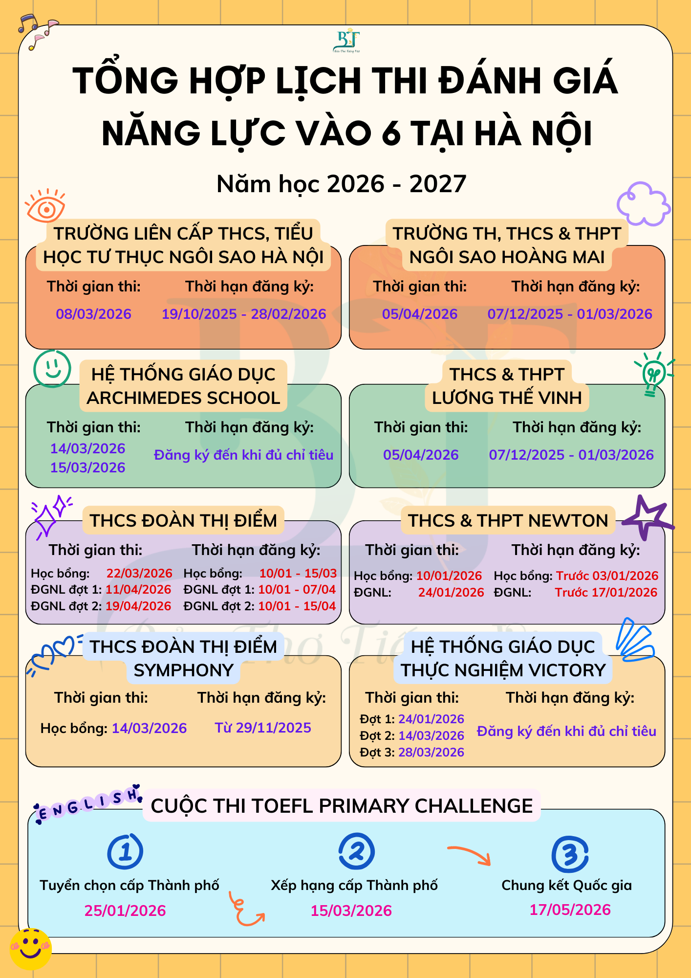 CLB Bảo Thơ Tiếng Việt xin gửi quý phụ huynh và học sinh tổng hợp lịch tuyển sinh vào lớp 6 các trường THCS tiêu biểu tại Hà Nội năm học 2026-2027.